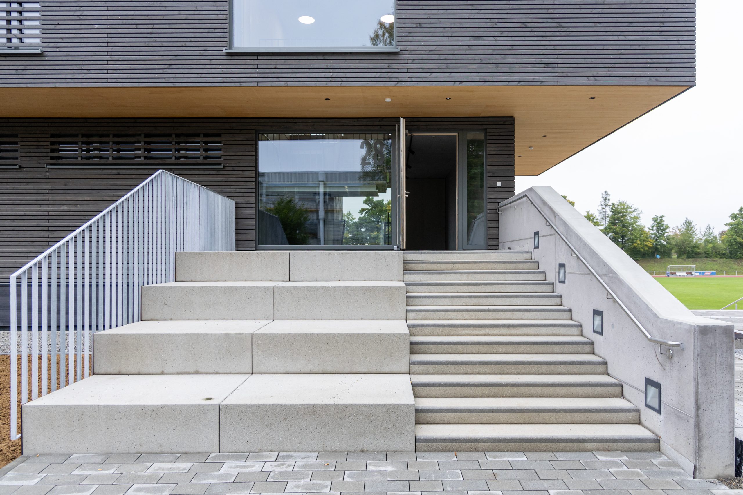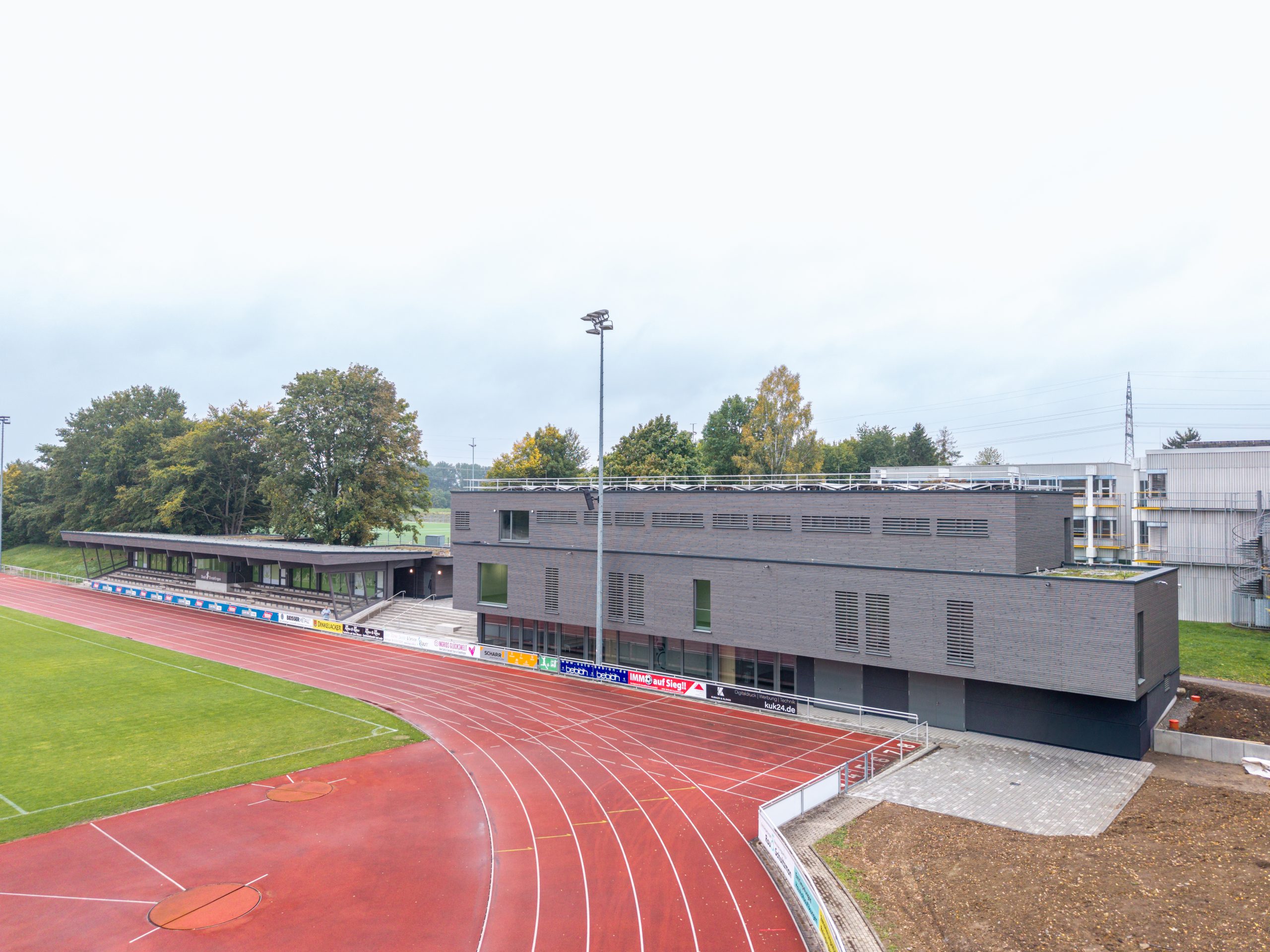 Mit der Fertigstellung des neuen Funktions- und Nebengebäudes und der sanierten Zuschauertribüne im Allmendstadion Maichingen hat die Stadt Sindelfingen einen weiteren wichtigen Baustein ihrer Stadtentwicklungsmaßnahme im Bereich Unterrieden / Floschen erfolgreich abgeschlossen. Das moderne, dreigeschossige Gebäude mit Holzfassade bietet künftig Platz für Umkleiden, Duschen, Sportgerätelager, Technikräume und einen Kiosk– funktional, nachhaltig und architektonisch ansprechend zugleich.