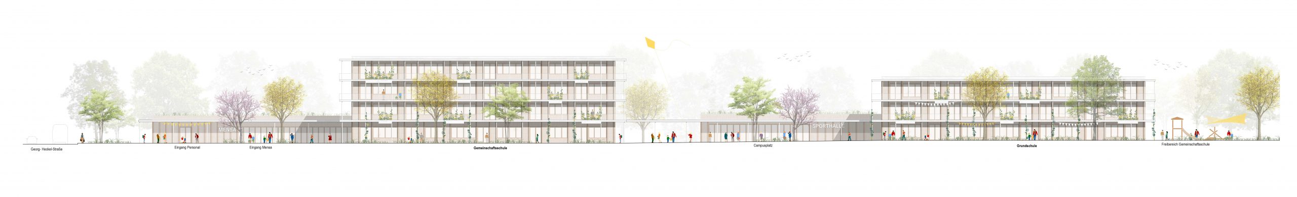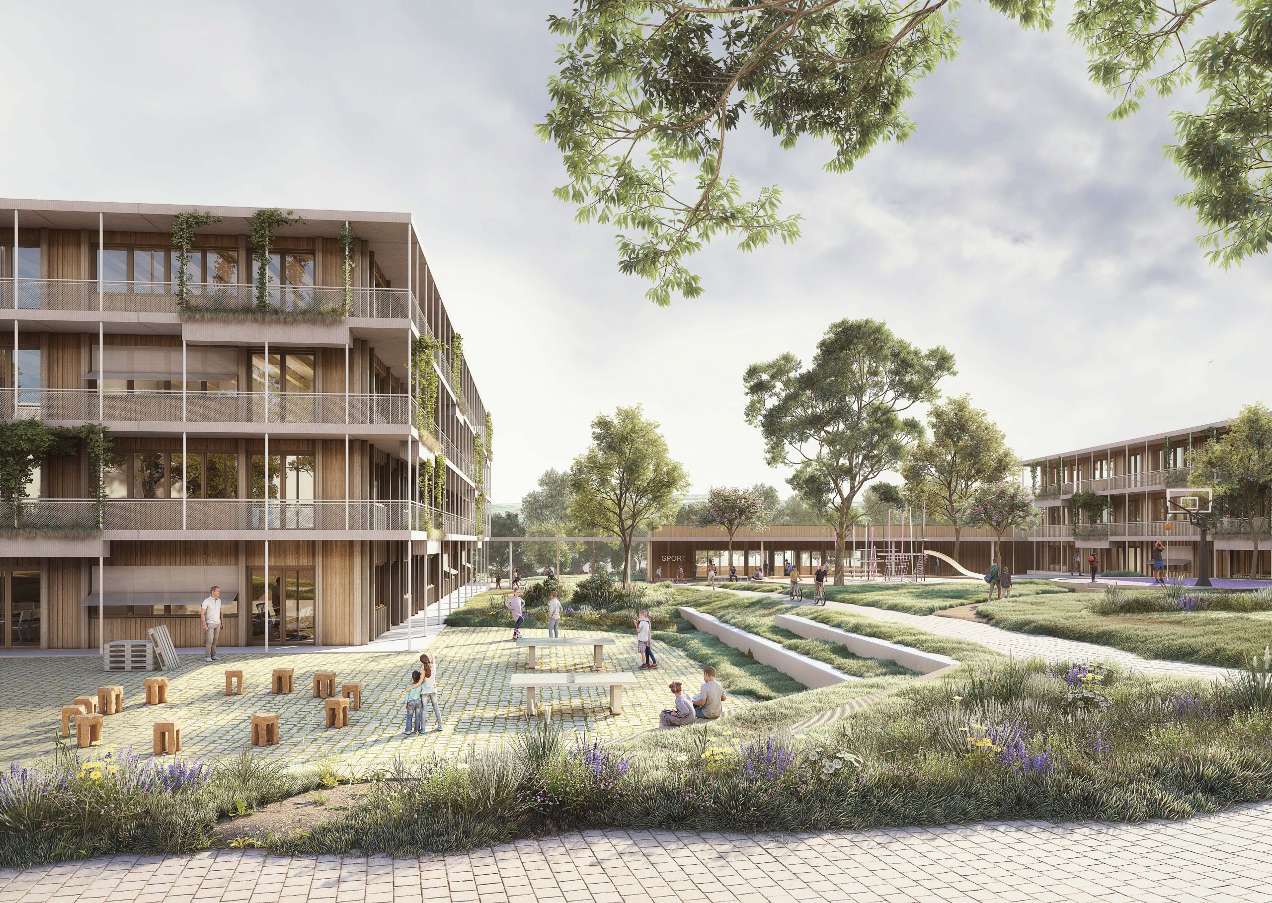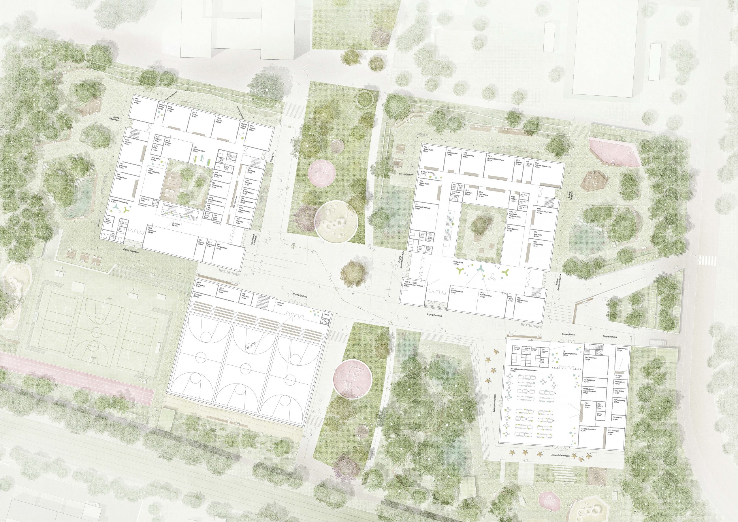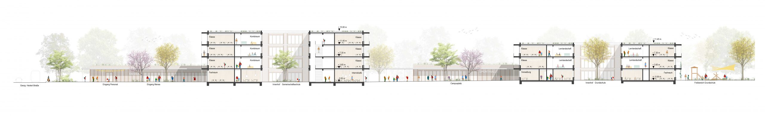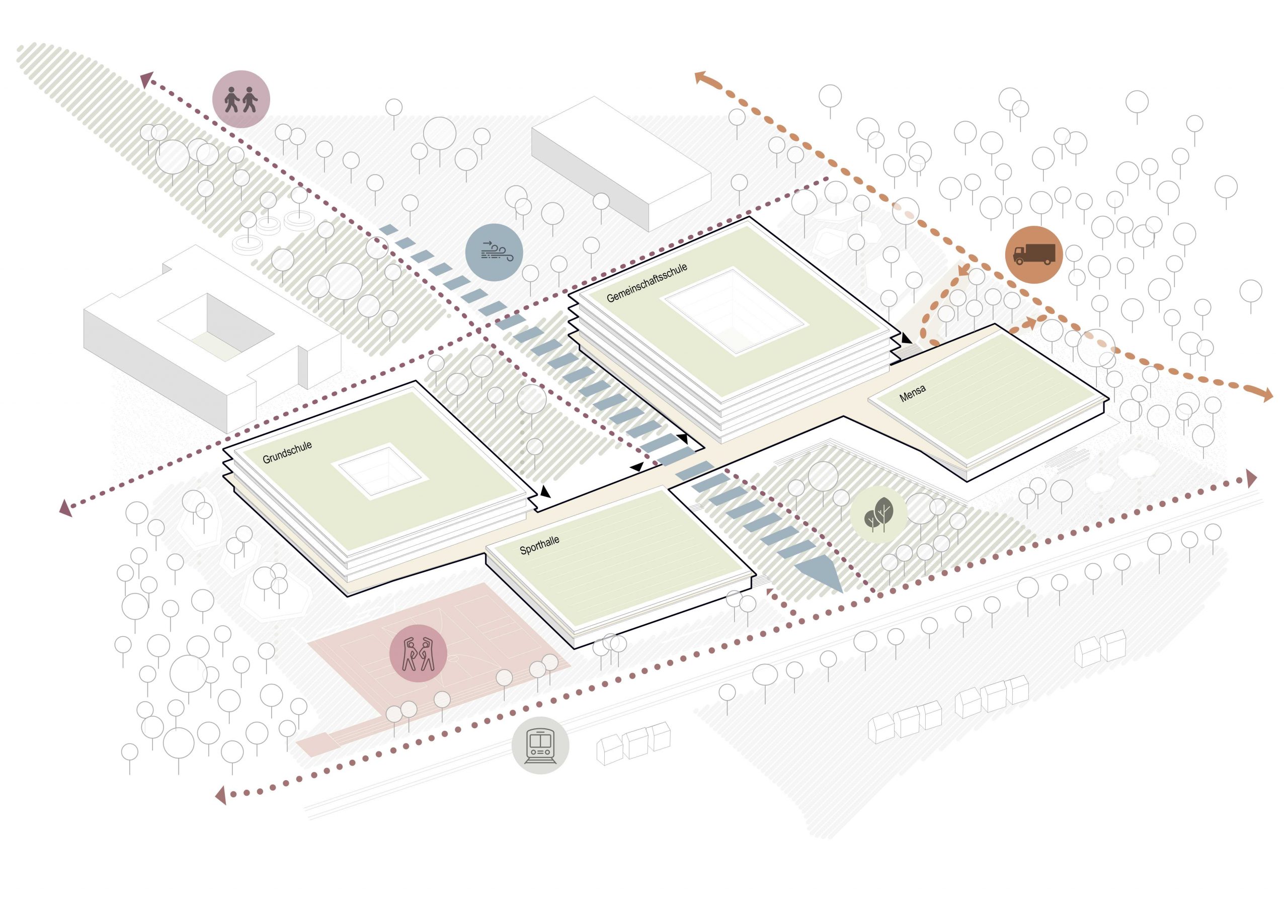 Die Schulen sind als kompakte Baukörper mit umlaufenden Fluchtbalkonen konzipiert, die ein filigranes Erscheinungsbild und flexible Lernlandschaften ermöglichen. Pausenhallen mit Blick in Innenhöfe werden durch zuschaltbare Theaterräume sowie offene Bereiche wie Bibliothek oder Internetcafé räumlich aktiviert. In den Obergeschossen gruppieren sich die Cluster der Klassenstufen um zentrale Lernlandschaften, die durch Innenhöfe gut belichtet und visuell verknüpft sind. Sporthalle und Mensa nutzen die Topografie für gute Erschließung und bieten innen wie außen qualitätvolle Aufenthaltsbereiche, alle Gebäude sind barrierefrei.