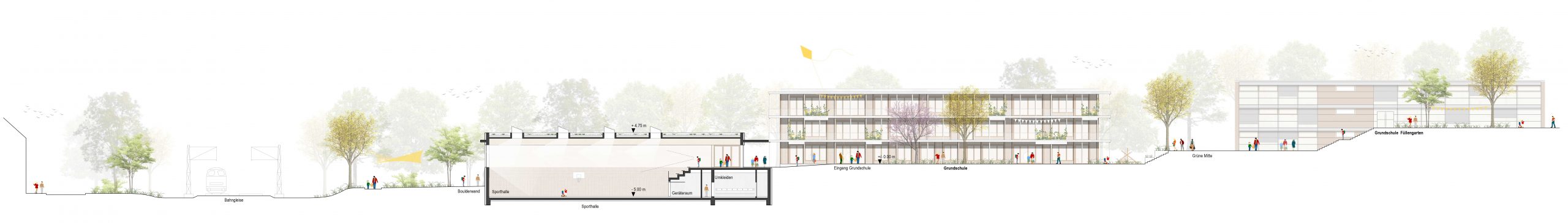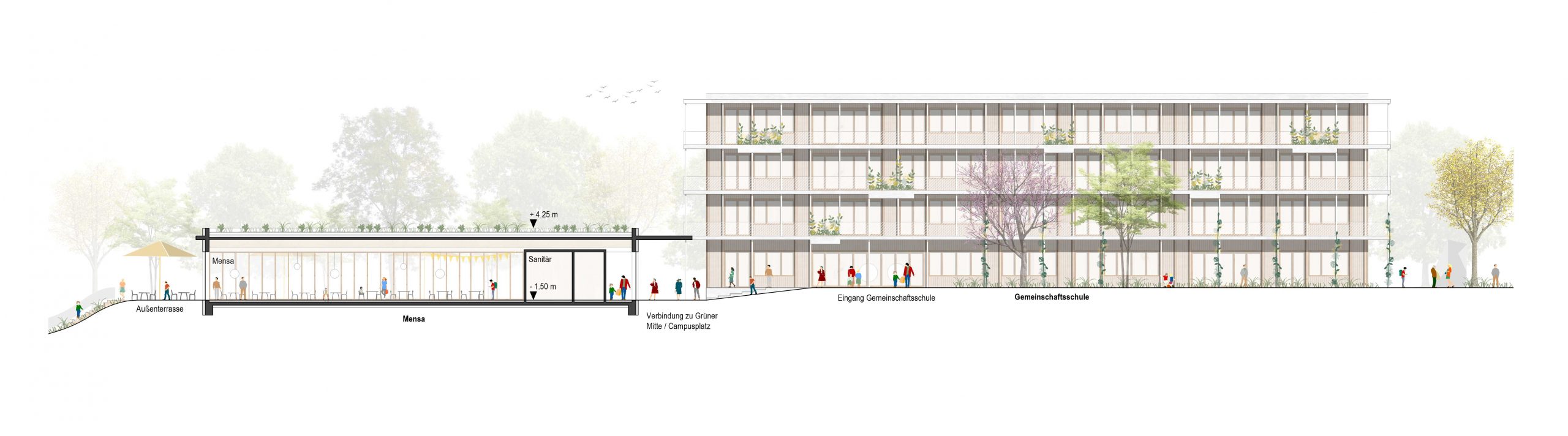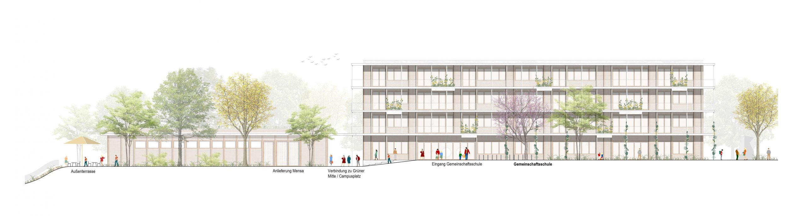 Aufgabe: Errichtung eines Schulcampus mit einer 4-zügigen Ganztagesgrundschule, 4- zügigen Ganztagesgemeinschaftsschule, Dreifeldsporthalle und Mensa