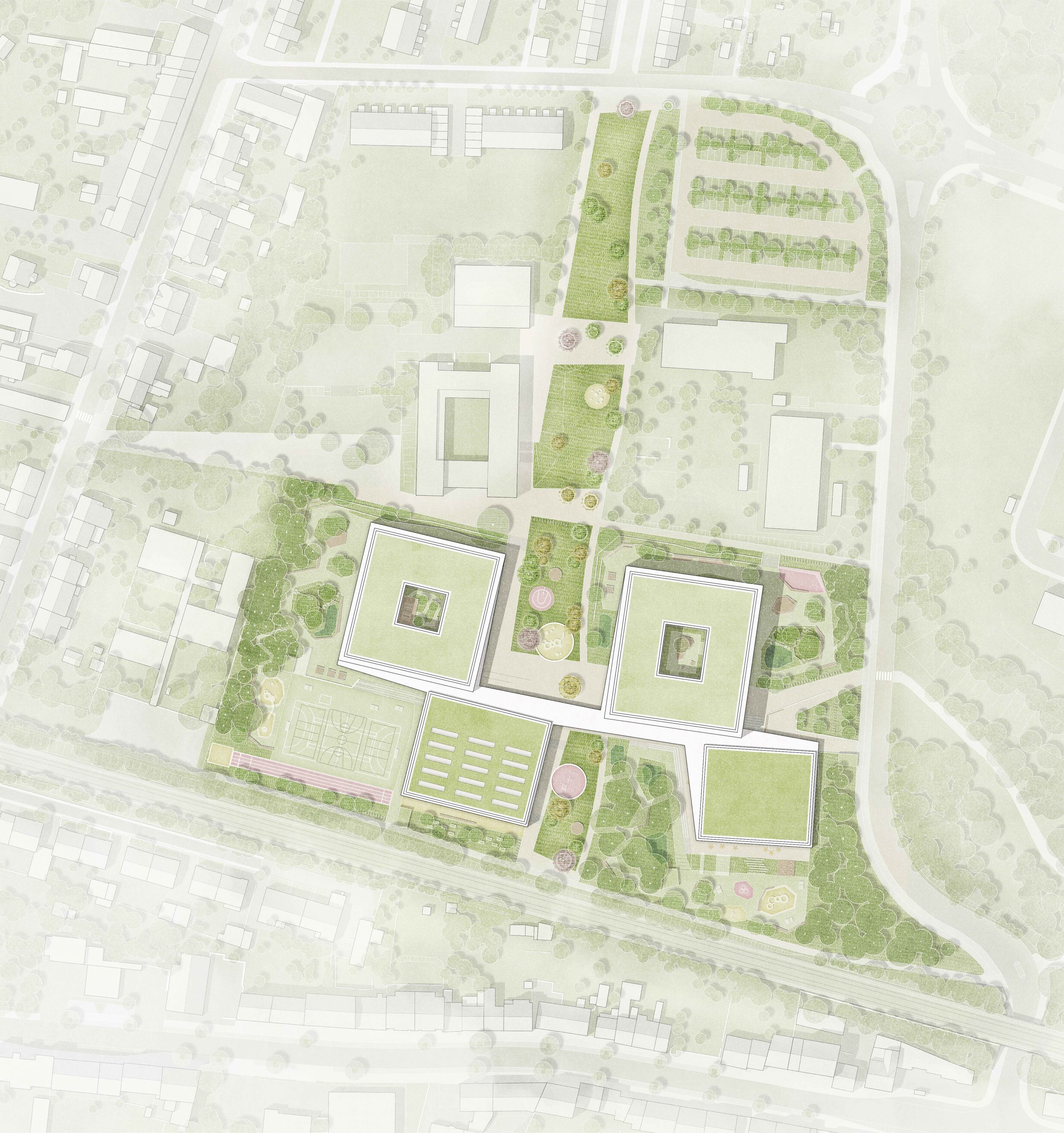 Die Freiräume orientieren sich an der Grünen Mitte mit Nord-Süd-Parkverbindung und einer öffentlichen Ost-West-Durchwegung, die den Bestand selbstverständlich fortsetzt. Öffentliche Spiel- und Sportflächen machen diesen Bereich zu einem überörtlichen Treffpunkt. Schulfreiflächen und Pausenhöfe werden in einen grünen Rahmen gefasst, der sie von Verkehrsflächen abschirmt und in vielseitig nutzbare Teilbereiche gliedert. Bewegungszonen, Ruhezonen, naturnahe Gartenbereiche sowie gemeinsame Außensportanlagen nutzen die vorhandene Topografie und sind über Rampen barrierefrei erreichbar.